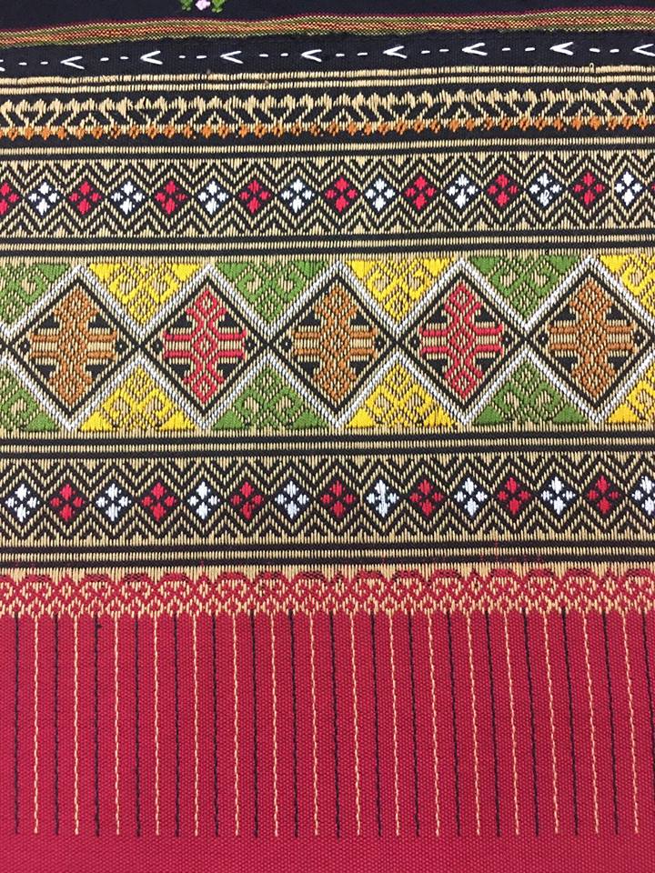 | คำอธิบาย : ตีนจกลายขอโบราณ ต่อซิ่นผ้าฝ้ายเก็บนก ลักษณะเป็นลายขอสี่อันอยู่ภายในกรอบสี่เหลี่ยมข้าวหลามตัด เป็นลายหนึ่งในผ้าทอลายโบราณ ซึ่งเป็นลวดลายเอกลักษณ์ของชาวไท-ยวน งานหัตถกรรมผ้าตีนจกเมืองลอง จากร้านเวียงเหนือ อำเภอลอง จังหวัดแพร่ |