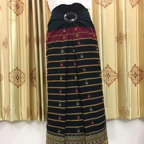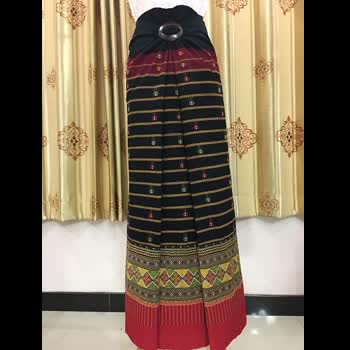 | คำอธิบาย : ตีนจกลายขอโบราณ ต่อซิ่นผ้าฝ้ายเก็บนก ลักษณะเป็นลายขอสี่อันอยู่ภายในกรอบสี่เหลี่ยมข้าวหลามตัด เป็นลายหนึ่งในผ้าทอลายโบราณ ซึ่งเป็นลวดลายเอกลักษณ์ของชาวไท-ยวน งานหัตถกรรมผ้าตีนจกเมืองลอง จากร้านเวียงเหนือ อำเภอลอง จังหวัดแพร่ |