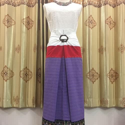 | คำอธิบาย : ตีนจกกิ๊นขนเม่นลายหลักนกกินน้ำร่วมต้น ลายประกอบขอมะเก่า ต่อซิ่นผ้าฝ้ายแท้สีธรรมชาติ ลายนกคู่กินน้ำฮ่วมต้น เป็นลายเก่าแก่ที่เลียนแบบธรรมชาติของนกที่กินน้ำจากน้ำเต้า เป็นชื่อลายหนึ่งในผ้าทอลายโบราณ ซึ่งเป็นลวดลายเอกลักษณ์ของชาวไท-ยวน งานหัตถกรรมผ้าตีนจกเมืองลอง จากร้านเวียงเหนือ อำเภอลอง จังหวัดแพร่ |