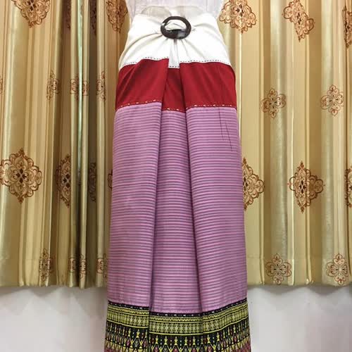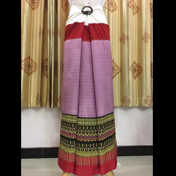 | คำอธิบาย : ตีนจกลายขันดอกไหมแท้ต่อซิ่นไหมแท้ทอมือ เป็นชื่อลายหนึ่งในผ้าทอลายโบราณ ซึ่งเป็นลวดลายเอกลักษณ์ของชาวไท-ยวน งานหัตถกรรมผ้าตีนจกเมืองลอง จากร้านเวียงเหนือ อำเภอลอง จังหวัดแพร่ |