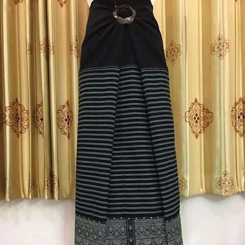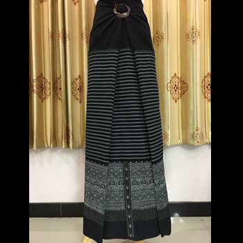| คำอธิบาย : ตีนจกลายหลักนกกินน้ำร่วมต้น ต่อซิ่นผ้าฝ้ายครามตาตั้ง เป็นชื่อลายหนึ่งในผ้าทอลายโบราณ ซึ่งเป็นลวดลายเอกลักษณ์ของชาวไท-ยวน งานหัตถกรรมผ้าตีนจกเมืองลอง จากร้านเวียงเหนือ อำเภอลอง จังหวัดแพร่ |