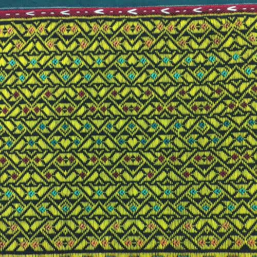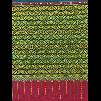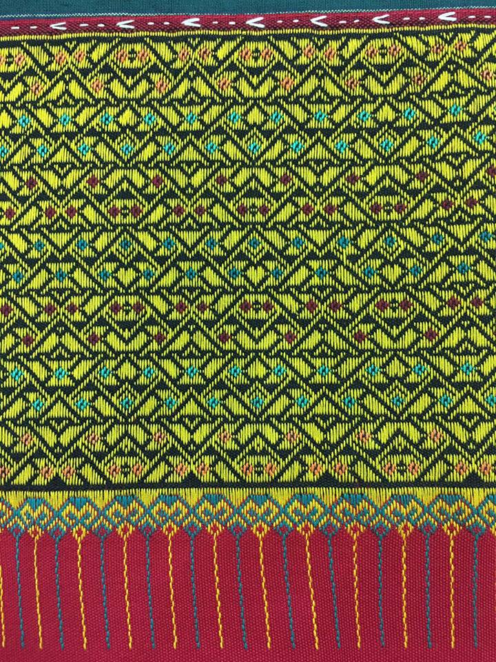| คำอธิบาย : ตีนจกลายดอกพิกุลทองต่อซิ่นผ้าฝ้ายแท้ เป็นผ้าทอลายโบราณ ซึ่งเป็นลวดลายเอกลักษณ์ของชาวไท-ยวน งานหัตถกรรมผ้าตีนจกเมืองลอง จากร้านเวียงเหนือ อำเภอลอง จังหวัดแพร่ |