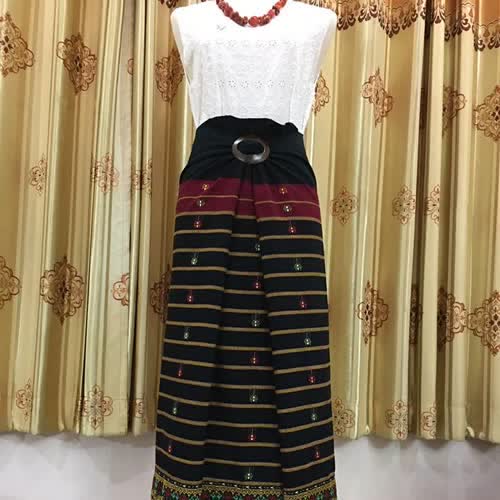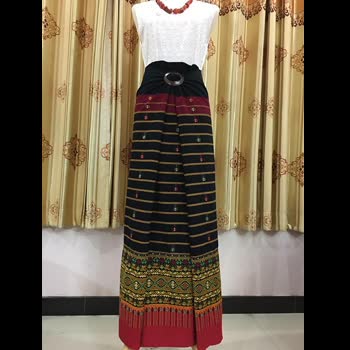 | คำอธิบาย : ตีนจกลายสำเภาลอยน้ำ ต่อซิ่นผ้าฝ้ายเก็บนก เป็นลายเก่าแก่ที่เสมือนเรือสำเภาลอยอยู่ในน้ำ ด้านบนเป็นเรือที่ลอยอยู่ในน้ำ ส่วนด้านล่างจะเป็นเงาของสำเภาที่สะท้อนออกมา เป็นหนึ่งในผ้าทอลายโบราณ ซึ่งเป็นลวดลายเอกลักษณ์ของชาวไท-ยวน งานหัตถกรรมผ้าทอตีนจกเมืองลอง จากร้านเวียงเหนือ อำเภอลอง จังหวัดแพร่ |