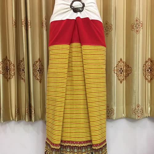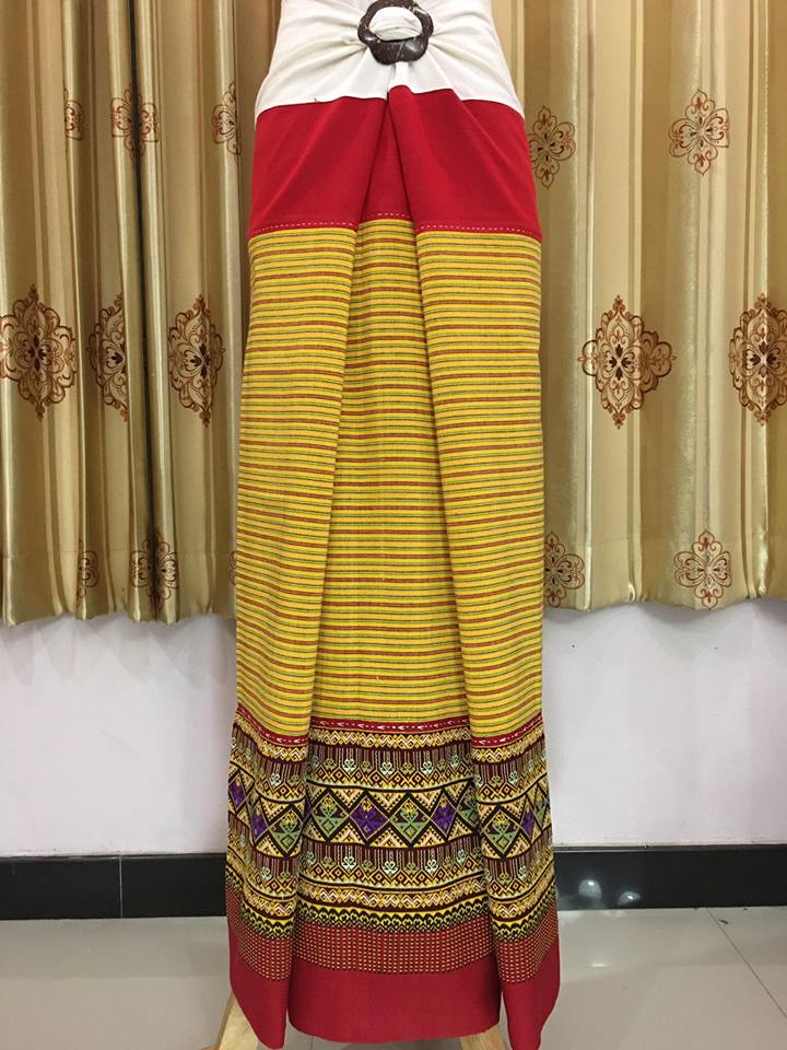 | คำอธิบาย : ตีนจกลายหงส์คู่ ต่อซิ่นผ้าฝ้ายตามะนาว ลายหงส์คู่มีรูปลักษณ์คล้ายนกมักพบเห็นในผ้าจกเมืองแพร่ทั่วไป ตัวหงส์จะแตกต่างจากนกคือในส่วนหัวจะมีช่อขึ้นไป และส่วนหางหงส์จะตวัดเข้ามา ในขณะที่ลายนก ส่วนหัวและหางจะเรียบ เป็นผ้าทอลายโบราณ ซึ่งเป็นลวดลายเอกลักษณ์ของชาวไท-ยวน งานหัตถกรรมผ้าทอตีนจกเมืองลอง จากร้านเวียงเหนือ อำเภอลอง จังหวัดแพร่ |