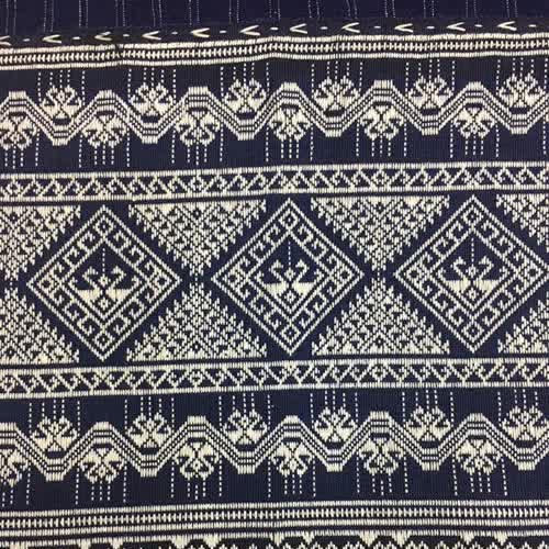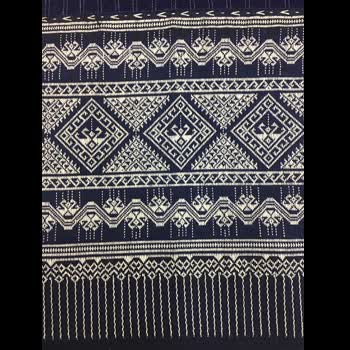 | คำอธิบาย : ตีนจกลายหลักนกกินน้ำร่วมต้น ต่อซิ่นผ้าฝ้ายครามตาตั้ง ลายนกคู่กินน้ำฮ่วมต้นเป็นลายเก่าแก่ที่เลียนแบบธรรมชาติของนกที่กินน้ำจากน้ำเต้า เป็นผ้าทอลายโบราณ ซึ่งเป็นลวดลายเอกลักษณ์ของชาวไท-ยวน งานหัตถกรรมผ้าทอตีนจกเมืองลอง จากร้านเวียงเหนือ อำเภอลอง จังหวัดแพร่ |