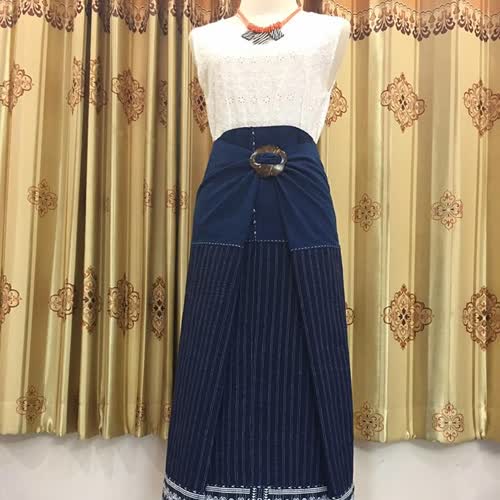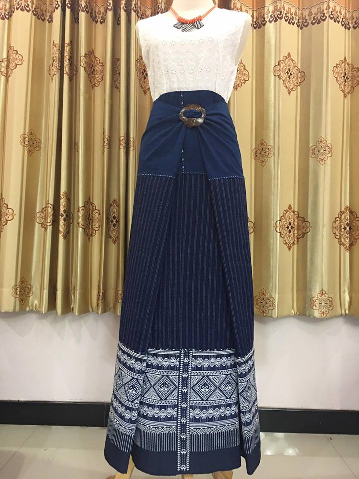 | คำอธิบาย : ตีนจกลายหลักนกกินน้ำร่วมต้น ต่อซิ่นผ้าฝ้ายครามตาตั้ง ลายนกคู่กินน้ำฮ่วมต้นเป็นลายเก่าแก่ที่เลียนแบบธรรมชาติของนกที่กินน้ำจากน้ำเต้า เป็นผ้าทอลายโบราณ ซึ่งเป็นลวดลายเอกลักษณ์ของชาวไท-ยวน งานหัตถกรรมผ้าทอตีนจกเมืองลอง จากร้านเวียงเหนือ อำเภอลอง จังหวัดแพร่ |