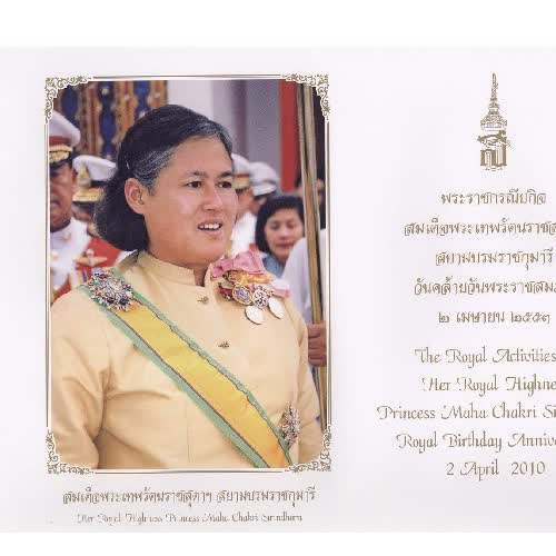 (2560). "แผ่นพับพระราชกรณียกิจสมเด็จพระเทพรัตนราชสุดาฯ สยามบรมราชกุมารี วันคล้ายวันพระราชสมภพ ๒ เมษายน ๒๕๕๓".