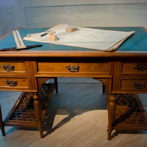| คำอธิบาย : โต๊ะทรงงานที่จัดแสดงในนิทรรศการเย็นศิระเพราะพระบริบาล |