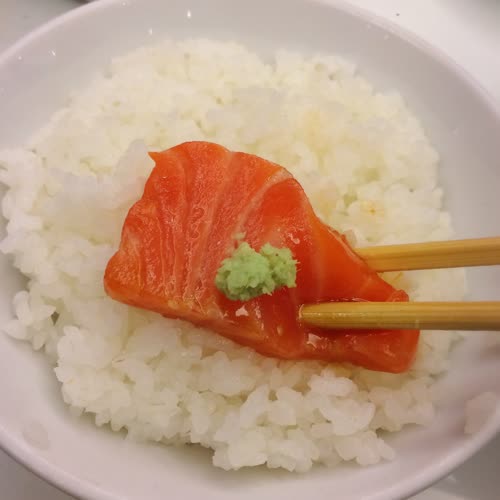 | คำอธิบาย : ปลาแซลมอนซาชิมิจิ้มวาซาบิทานคู่กับข้าวญี่ปุ่น |