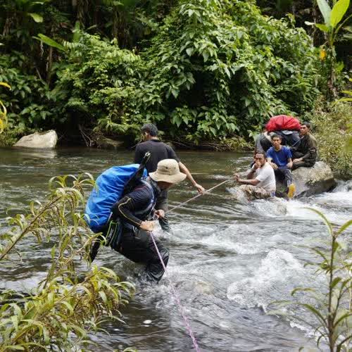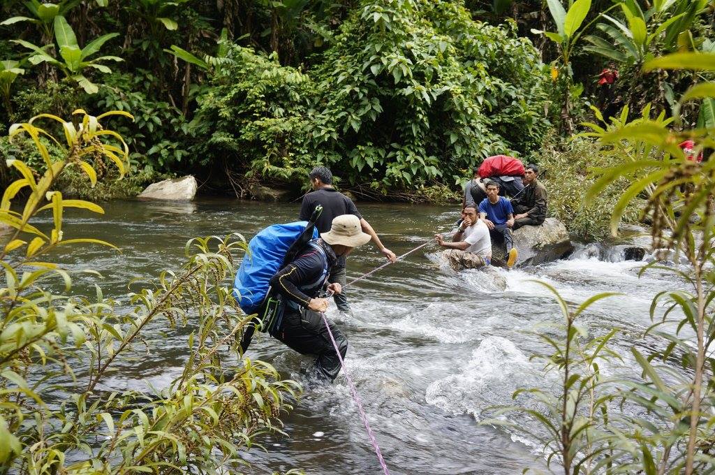 | คำอธิบาย : การเดินข้ามน้ำที่เชี่ยวกรากโดยใช้เชือกเป็นอุปกรณ์ การเดินทางในป่า เขตพื้นที่อุทยานแห่งชาติดงหัวสาว ที่ราบสูงบอละเวน เมืองปากซอง ประเทศลาว |