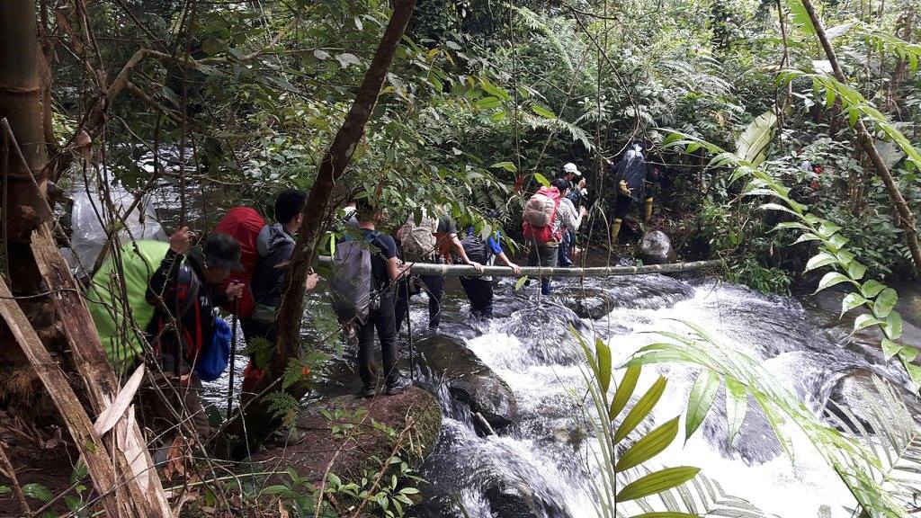 | คำอธิบาย : การเดินข้ามน้ำที่เชี่ยว โดยใช้ไม้ไผ่ยึด การเดินทางในป่า เขตพื้นที่อุทยานแห่งชาติดงหัวสาว ที่ราบสูงบอละเวน เมืองปากซอง ประเทศลาว |