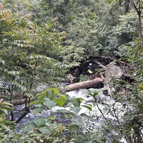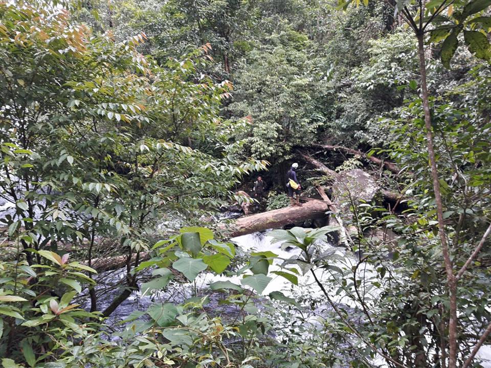 | คำอธิบาย : การเดินข้ามน้ำ ผ่านสะพานต้นไม้ที่ล้มพาดระหว่างลำน้ำ เขตพื้นที่อุทยานแห่งชาติดงหัวสาว ที่ราบสูงบอละเวน เมืองปากซอง ประเทศลาว |