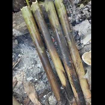 | คำอธิบาย : ข้าวหลาม เป็นการทำข้าวให้สุกโดยใช้กระบอกไม้ไผ่เป็นภาชนะในการเผา เป็นหนึ่งในวิธีการหุงหาอาหารเพื่อดำรงชีพในการเดินป่า อุทยานแห่งชาติดงหัวสาว ที่ราบสูงบอละเวน เมืองปากซอง ประเทศลาว (ปากเซ แขวงจำปาสัก สปป.ลาว) |
