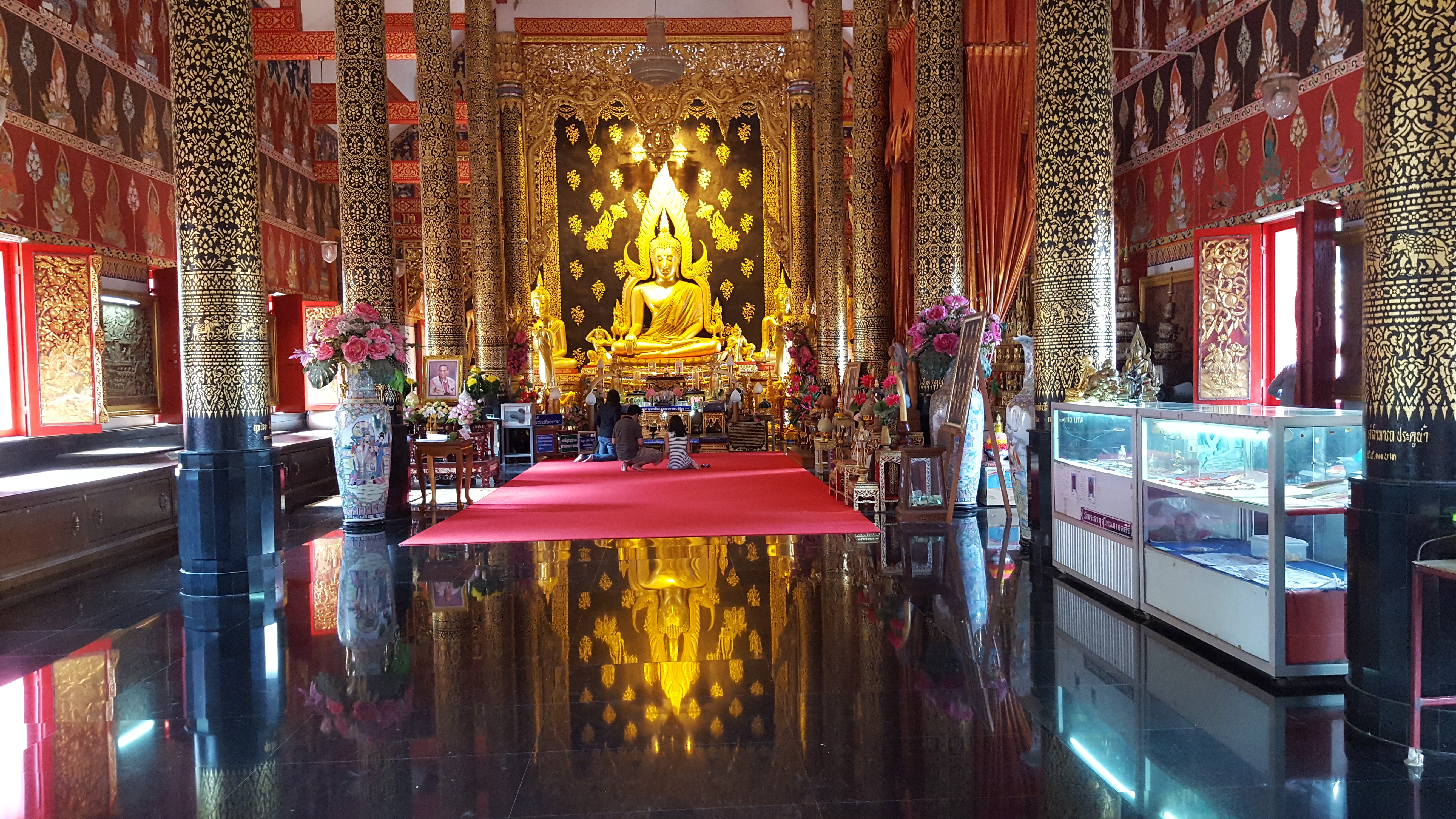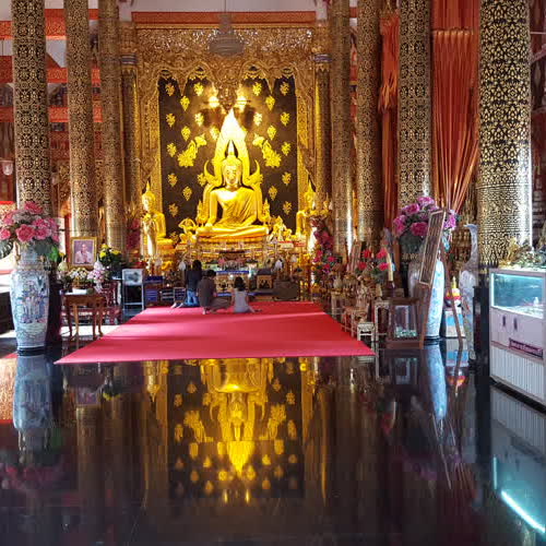 | คำอธิบาย : ภายในโบสถ์วัดพระธาตุสุโทนมงคลคีรี (วัดพระธาตุสุโทนมงคลคีรีสามัคคีธรรม) อ.เด่นชัย จ.แพร่ เป็นวัดที่มีสถาปัตยกรรมล้านนาแบบผสมผสาน โดยได้จำลองรูปแบบที่เป็นจุดเด่นของวัดแต่ละแห่งที่สำคัญของภาคเหนือ และจากประเทศอื่นได้แก่ พม่า จีน และลาว มารวบรวมไว้เป็นพุทธศิลป์ที่วัดนี้ |
