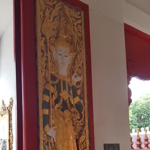 คำอธิบาย : บานประตูโบสถ์ วัดพระธาตุสุโทนมงคลคีรี (วัดพระธาตุสุโทนมงคลคีรีสามัคคีธรรม) อ.เด่นชัย จ.แพร่ เป็นวัดที่มีสถาปัตยกรรมล้านนาแบบผสมผสาน โดยได้จำลองรูปแบบที่เป็นจุดเด่นของวัดแต่ละแห่งที่สำคัญของภาคเหนือ และจากประเทศอื่นได้แก่ พม่า จีน และลาว มารวบรวมไว้เป็นพุทธศิลป์ที่วัดนี้ |