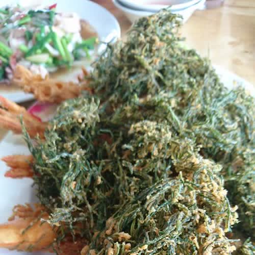 กุ้งชุปแป้งทอดโรยหน้าด้วยใบชะครามทอด