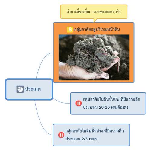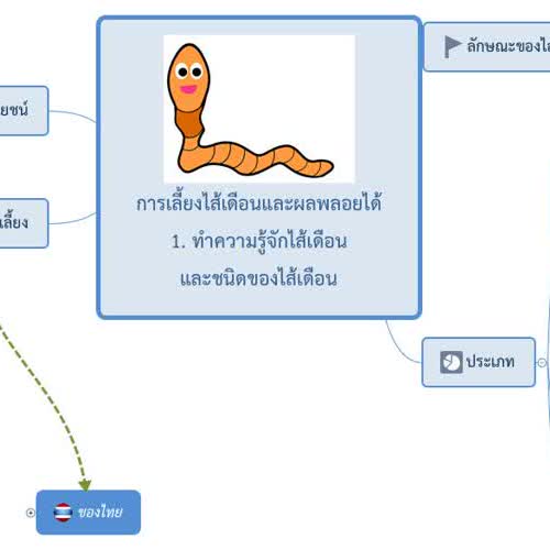 | คำอธิบาย : เป็นแผนที่ความคิดเพื่ออธิบายภาพรวมของสื่อชุด การเลี้ยงไส้เดือนและผลพลอยได้ ตอนที่ 1 ในส่วนของประเภทของไส้เดือน |