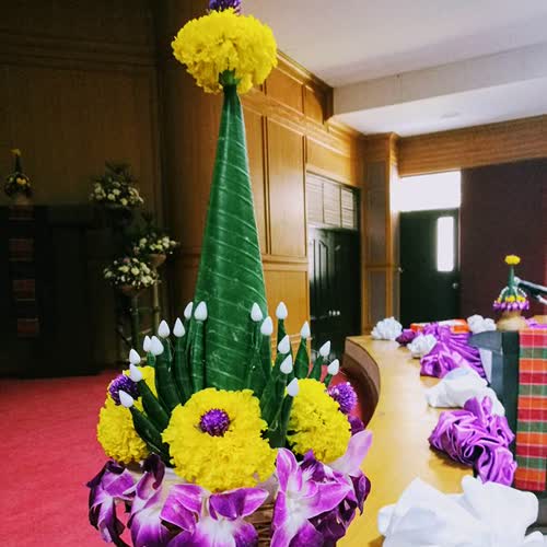| คำสำคัญ : การประยุกต์ขันหมากเบ็งในการจัดดอกไม้, ขันหมากเบ็ง, ขันหมากเบญจ์, การใบตอง |