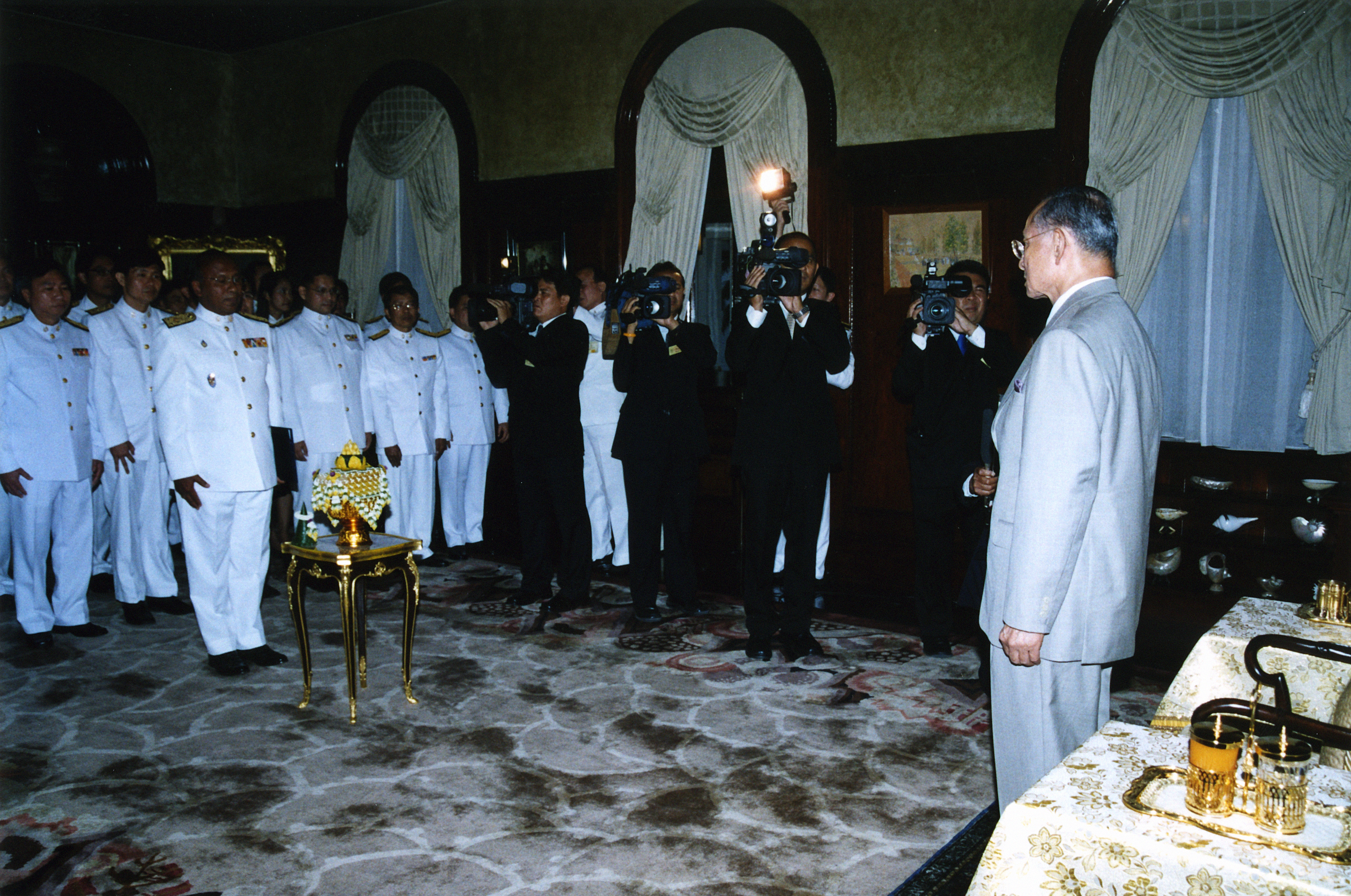 | คำอธิบาย : พระบาทสมเด็จพระปรมินทรมหาภูมิพลอดุลยเดชได้ทรงพระกรุณาโปรดเกล้าฯ พระราชทานพระบรมราชวโรกาสให้ตุลาการศาลปกครองสูงสุดและตุลาการศาลปกครองชั้นต้นเข้าเฝ้าฯ ถวายสัตย์ปฏิญาณก่อนเข้ารับหน้าที่ พร้อมทั้งพระราชทานพระราชดำรัสเพื่อเป็นเครื่องเตือนใจและเป็นแนวทางในการปฏิบัติภารกิจ ตุลาการศาลปกครองชั้นต้นรุ่นที่ 4 วันที่ 19 ต.ค. 2548_1 |