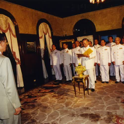 | คำอธิบาย : พระบาทสมเด็จพระปรมินทรมหาภูมิพลอดุลยเดชได้ทรงพระกรุณาโปรดเกล้าฯ พระราชทานพระบรมราชวโรกาสให้ตุลาการศาลปกครองสูงสุดและตุลาการศาลปกครองชั้นต้นเข้าเฝ้าฯ ถวายสัตย์ปฏิญาณก่อนเข้ารับหน้าที่ พร้อมทั้งพระราชทานพระราชดำรัสเพื่อเป็นเครื่องเตือนใจและเป็นแนวทางในการปฏิบัติภารกิจ ตุลาการศาลปกครองสูงสุด รุ่นที่ 1 วันที่ 19 มิ.ย. 2543 |