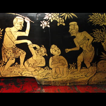 | คำอธิบาย : ภาพวาดวรรณกรรมพื้นบ้านยายกับตาปลูกถั่วปลูกงา ที่เชิงบานหน้าต่างในพระอุโบสถ วัดพระเชตุพนวิมลมังคลารามราชวรมหาวิหาร |