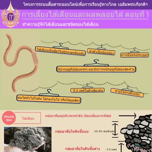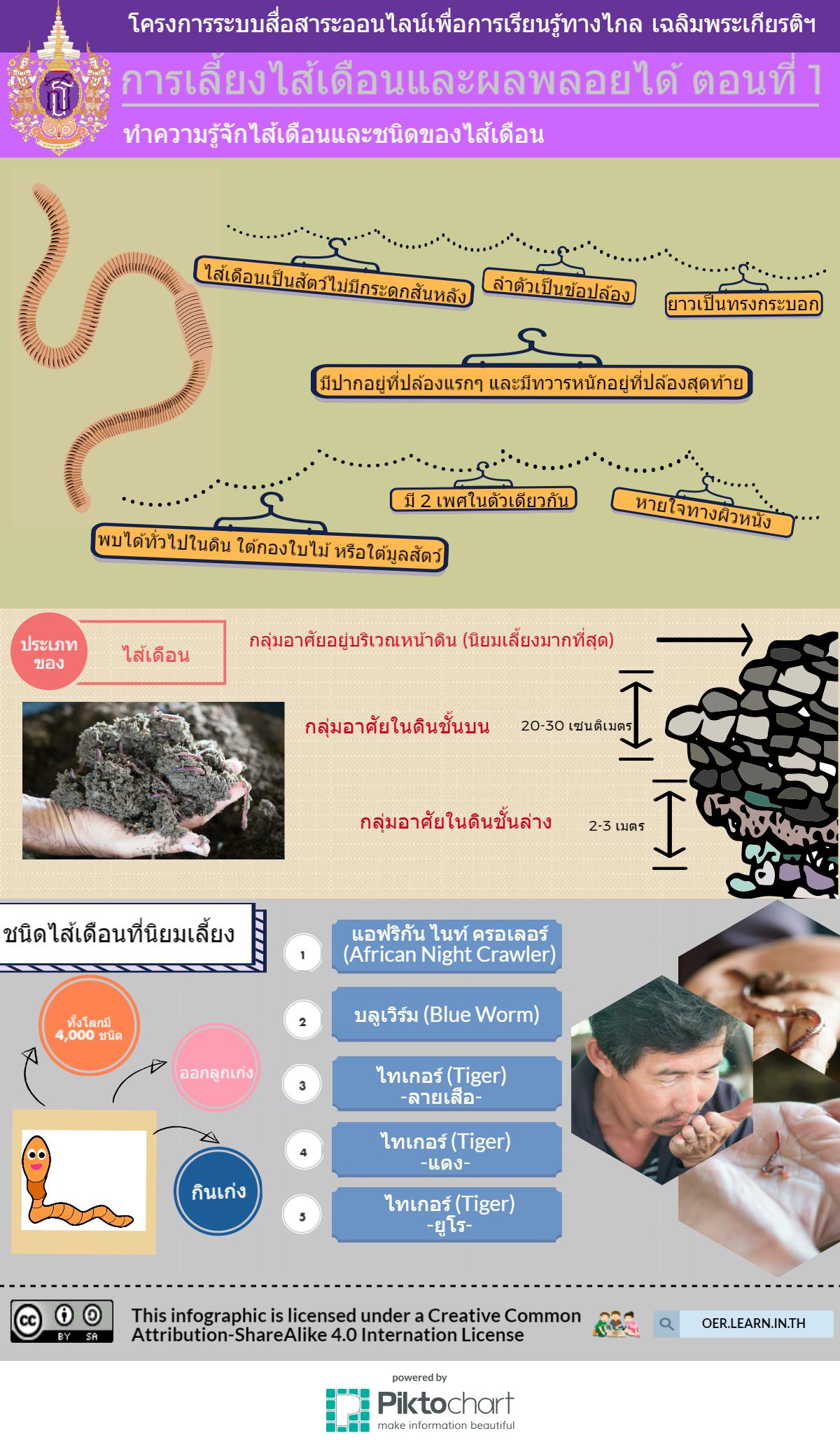 Infographic การเลี้ยงไส้เดือนและผลพลอยได้ ตอนที่ 1 ทำความรู้จักไส้เดือนและชนิดของไส้เดือน ได้รับใบอนุญาตภายใต้ ให้เผยแพร่-ดัดแปลง-โดยต้องระบุที่มา 3.0 Thailand.
