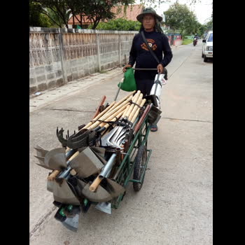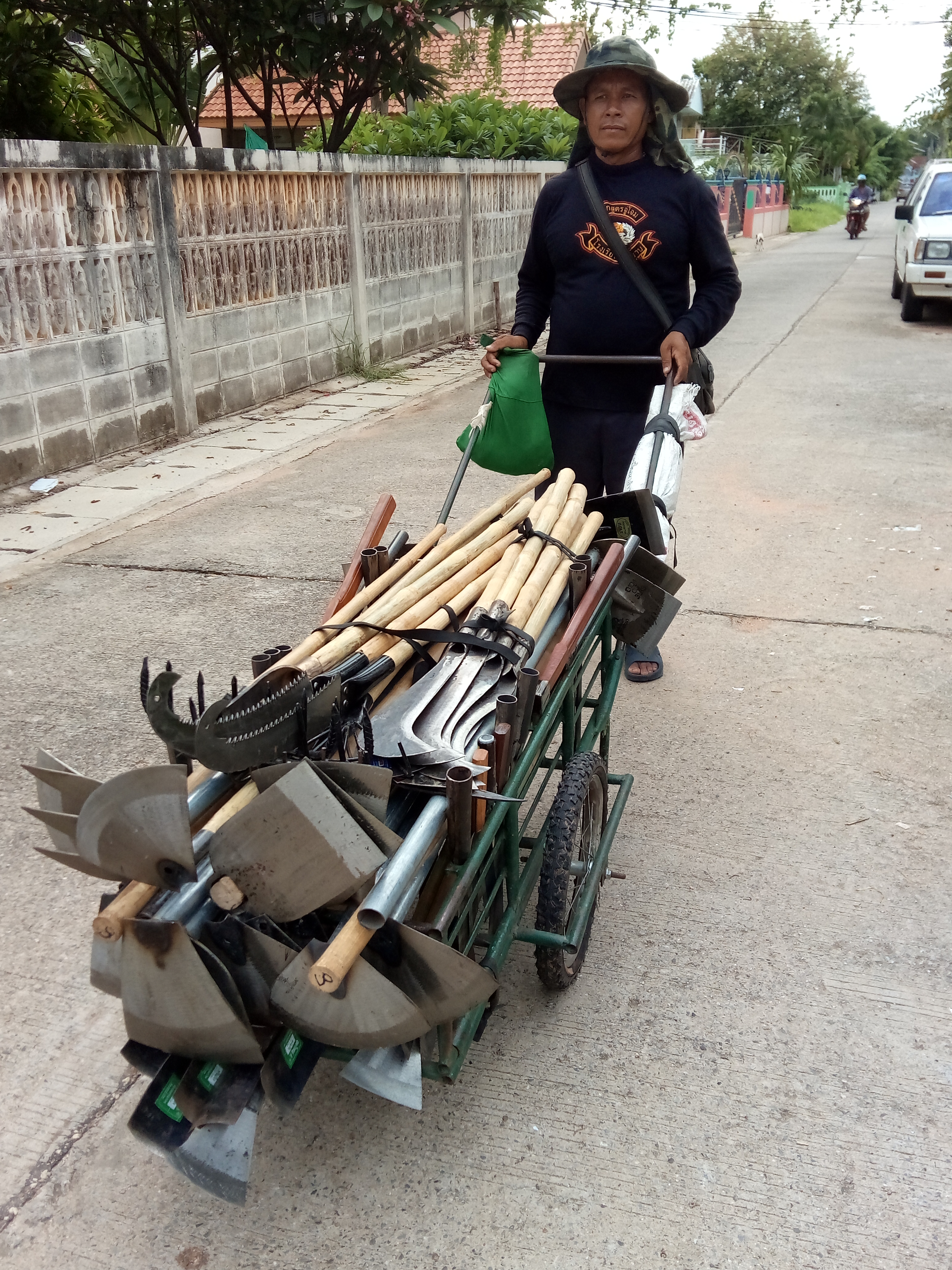 | คำอธิบาย : คุณลุงขายมีดและอุปกรณ์ทำสวนไปตามหมู่บ้าน มีรายได้เฉลี่ยวันละประมาณ 300-500 บาท หักต้นทุนแล้ว อนุญาตให้นำภาพมาเผยแพร่ได้ |