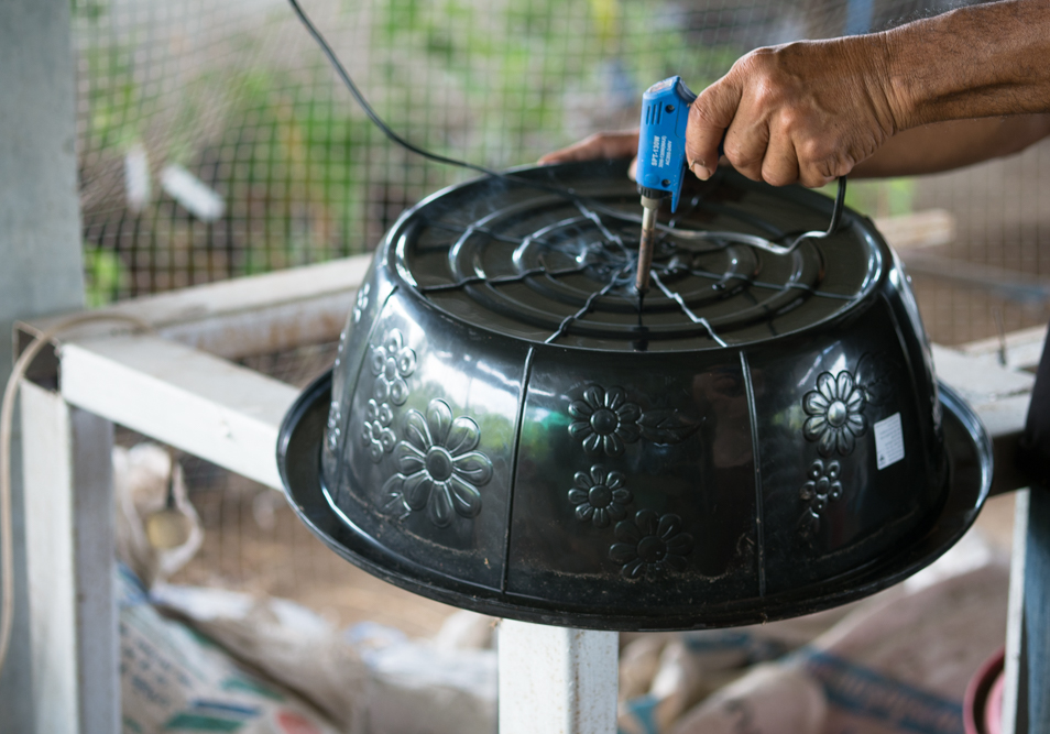 (2560). การเจาะกะละมังพลาสติกด้วยหัวแร้ง,