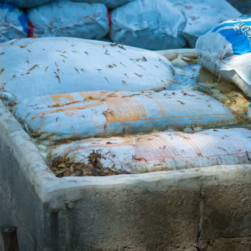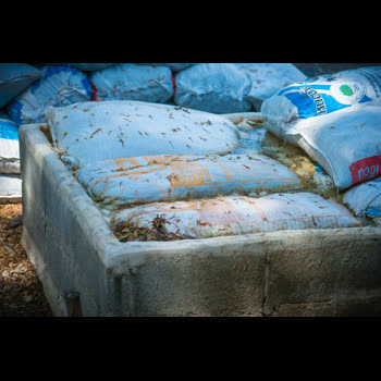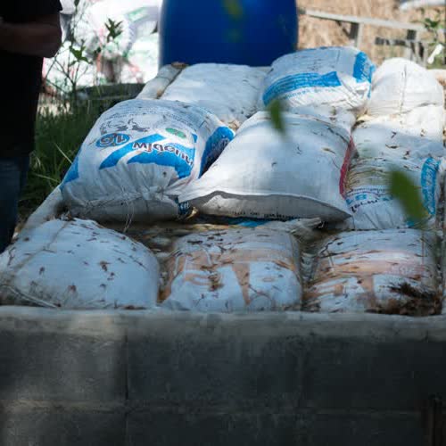 | คำอธิบาย : เอากระสอบมูลวัว แช่ไปในบ่อซีเมนต์ที่เตรียมไว้ แช่ไว้ 7-15 วัน จึงจะสามารถนำไปใช้เลี้ยงไส้เดือนได้ สาเหตุที่ต้องแช่น้ำก่อน เพราะมูลวัวเวลาถูกน้ำจะเกิดความร้อนประมาณ 55 - 60 องศา ซึ่งถ้าเอาไปใช้เลย ไส้เดือนจะอยู่ไม่ได้ จึงต้องแช่ให้ความร้อนค่อยๆ หมดไป |