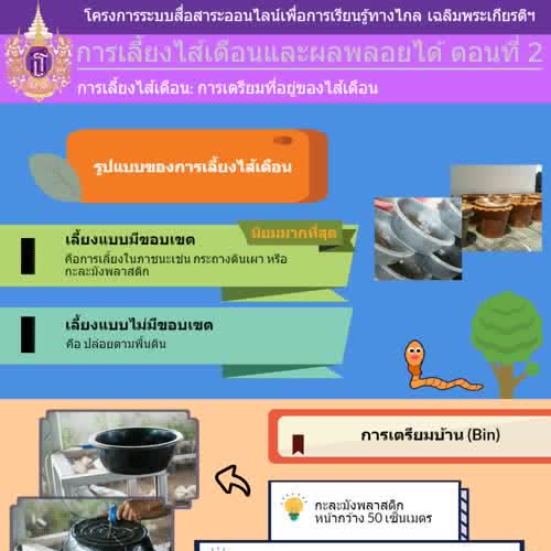 | ชื่อเรื่อง : Infographic การเลี้ยงไส้เดือนและผลพลอยได้ ตอนที่ 2 การเลี้ยงไส้เดือน: การเตรียมที่อยู่ของไส้เดือน |