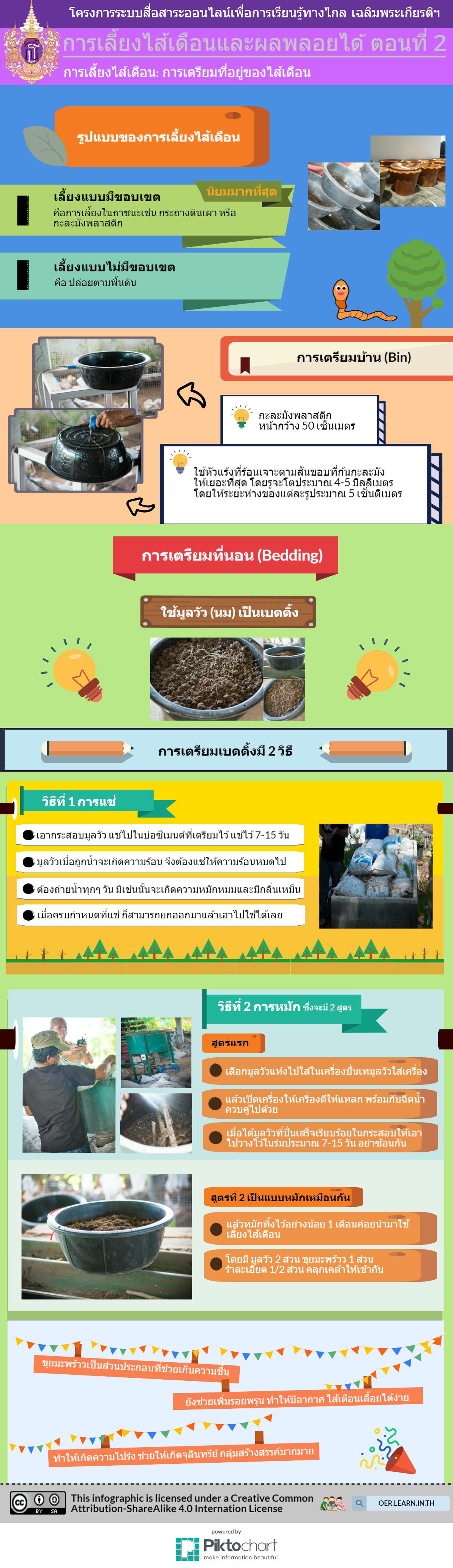 Infographic การเลี้ยงไส้เดือนและผลพลอยได้ ตอนที่ 2 การเลี้ยงไส้เดือน: การเตรียมที่อยู่ของไส้เดือน ได้รับใบอนุญาตภายใต้ ให้เผยแพร่-ดัดแปลง-โดยต้องระบุที่มา 3.0 Thailand.
