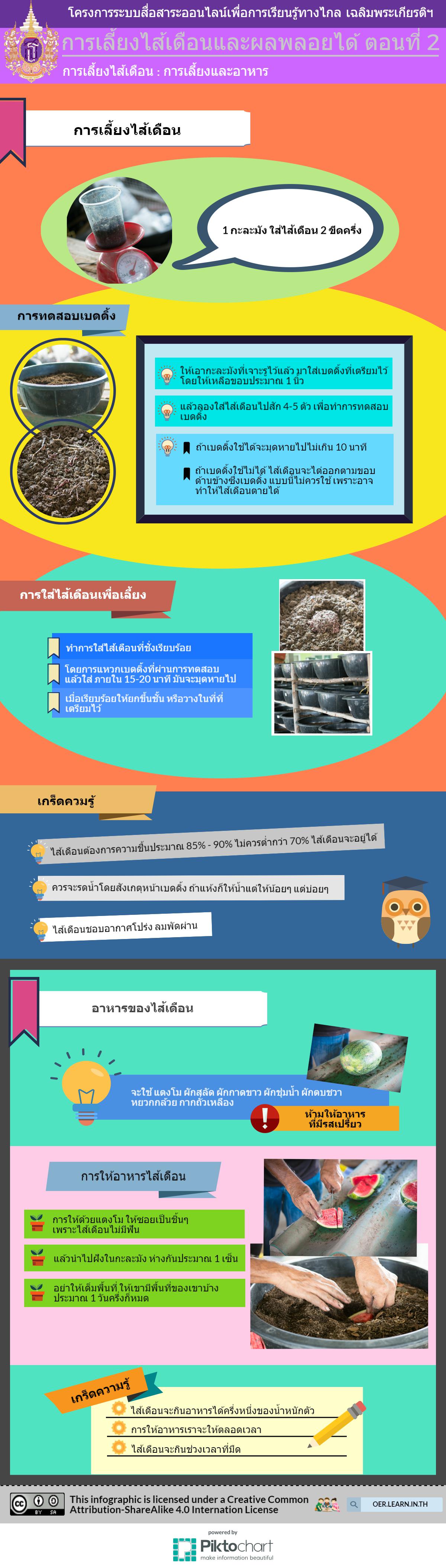 Infographic การเลี้ยงไส้เดือนและผลพลอยได้ ตอนที่ 2 การเลี้ยงไส้เดือน: การเลี้ยงและอาหาร ได้รับใบอนุญาตภายใต้ ให้เผยแพร่-ดัดแปลง-โดยต้องระบุที่มา 3.0 Thailand.