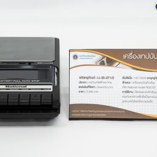 | คำอธิบาย : รหัสครุภัณฑ์ : LI-35-071/2 เริ่มใช้เมื่อ : 16/7/2535 อายุครุภัณฑ์ : 24 ปี\\\\\\\ประเภท : ครุภัณฑ์ไฟฟ้าและวิทยุ แหล่งเงินที่จัดหา : เงินงบประมาณ ราคา : 2,500 บาท\\\\\\\ลักษณะ : เครื่องเทปบันทึกเสียง ยี่ห้อ National model RQ2102 \\\\\\\การใช้งาน : ใช้เล่นและบันทึกสัญญาณเสียงโดยใช้งานร่วมกับเทปคาสเซ็ทซึ่งเป็นการบันทึกเสียงลงสื่อรูปแบบหนึ่งโดยใช้แถบแม่เหล็ก\\\\\\\ภาพ : มนตรี เล้าหะชัย |