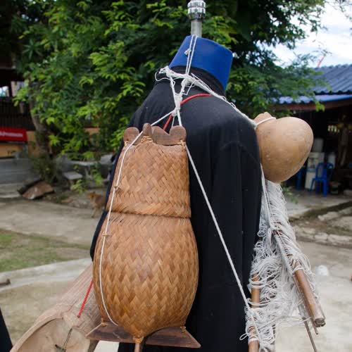 คำอธิบาย : ใส่เสื้อฮีด้านหน้าอยู่ข้างหน้า และอุปกรณ์ฟืมเขา ทอผ้าได้จึงออกเรือนได้ น้ำเต้าใส่น้ำล้างเท้า จะได้มีลูกหลานรวดเร็วและมากมายเหมือนน้ำเต้า กระบอกน้ำเอาไว้ล้างหน้า และตั่งนั่งสื่อไม่ให้เลิกกับสามี |