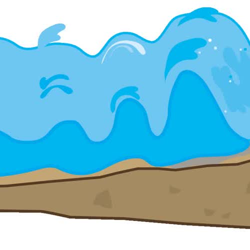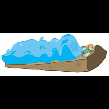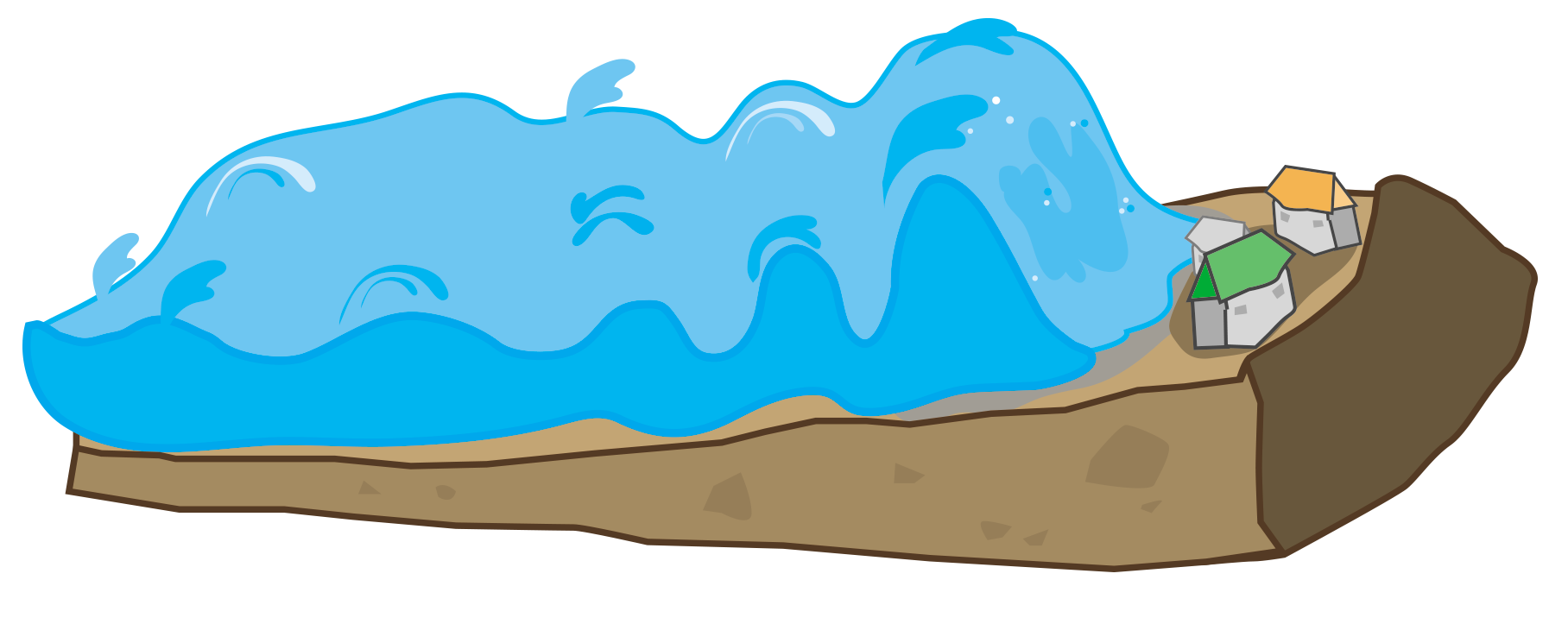 | คำอธิบาย : ภาพแสดงสึนามิยกตัวขึ้นเป็นคลื่นสูง ลักษณะเหมือนกำแพง เคลื่อนที่เข้าจู่โจมชายฝั่ง |