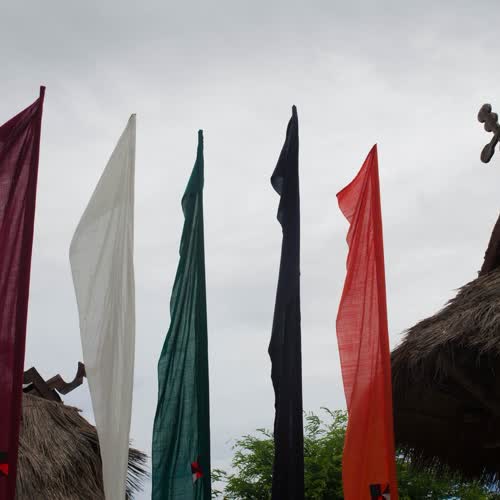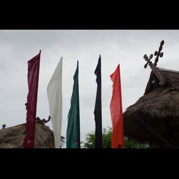 | คำอธิบาย : ธงสีหลัก 5 สี แดง ขาว เขียว ดำ ส้ม จะไม่ปักสีส้มติดสีเขียว (เพราะสองสีติดกันใช้ในงานศพ) ขอกุดด้านซ้ายเป็นขอกุดงอง๊อกและขวาขอกุดบัวญัวมี 10 ปุ่มแทนแถน 10 องค์ |