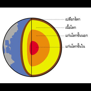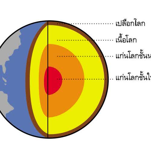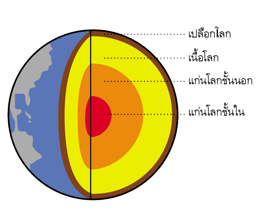 | คำอธิบาย : โลกของเรามีอายุประมาณ 4600 ล้านปี ชั้นนอกสุดของโลกเป็นหิน เรียกว่า เปลือกโลก (Crust)ใต้ชั้นเปลือกโลก เรียกว่าเนื้อโลก (Mantle) และแกนในสุดของโลกเรียกว่า แก่นโลก (Core) ซึ่งแบ่งเป็นแก่นโลกชั้นนอก และแก่นโลกชั้นในเปลือกโลกประกอบด้วยเปลือกโลกภาคพื้นทวีป (Continental crust)และเปลือกโลกใต้มหาสมุทร (oceanic crust) |