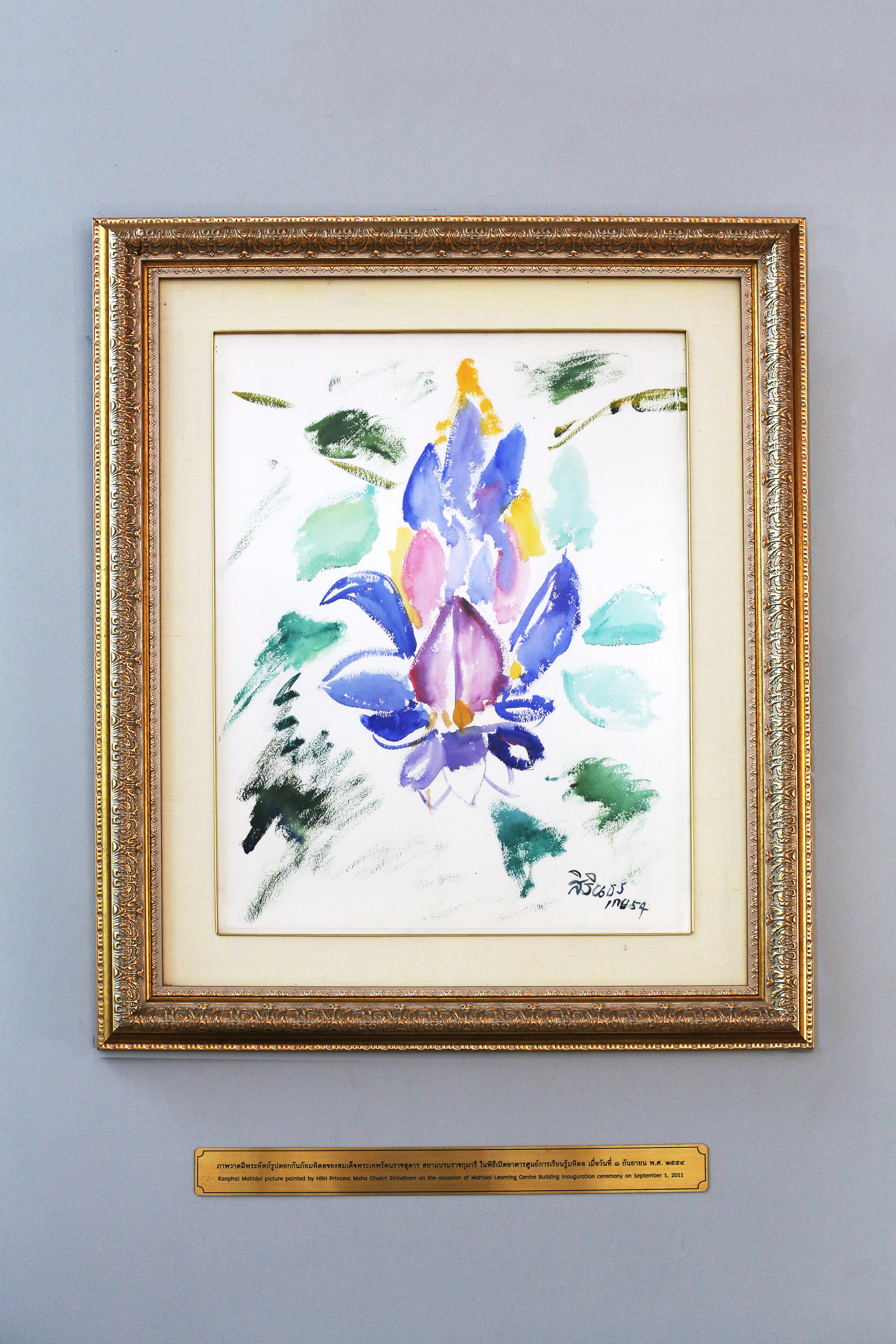 | คำอธิบาย : ภาพวาดดอกกันภัยมหิดล ฝีพระหัตถ์สมเด็จพระเทพรัตนราชสุดาฯ สยามบรมราชกุมารี ทรงวาดและพระราชทานให้กับมหาวิทยาลัยมหิดล ในวโรกาสที่เสด็จพระราชดำเนินมาทรงเปิดอาคารศูนย์การเรียนรู้มหิดล หอพระราชประวัติสมเด็จพระบรมราชชนก และหอเกียรติยศแห่งมหาวิทยาลัยมหิดล เมื่อวันที่ 1 กันยายน พ.ศ.2554 |