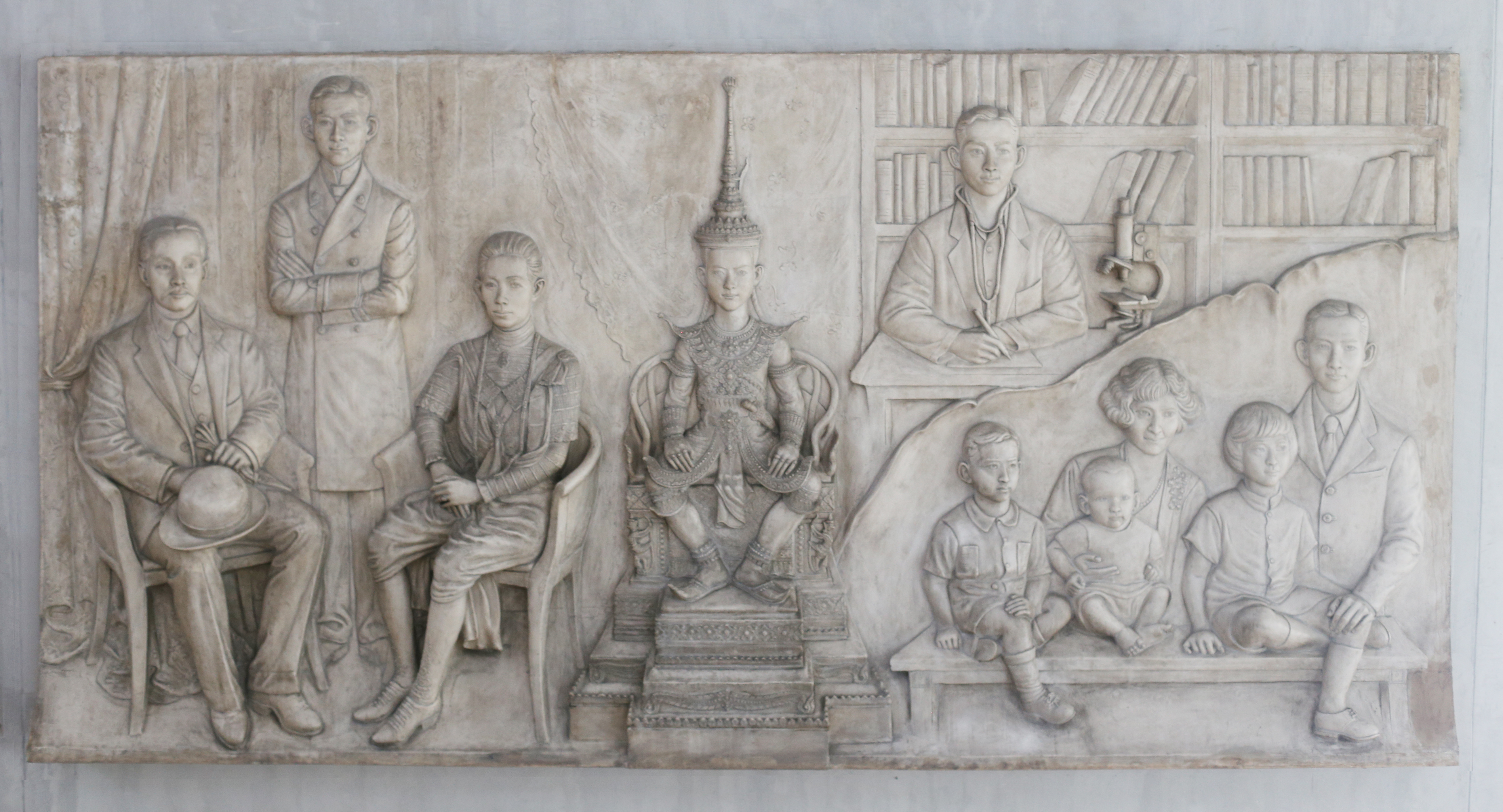 | คำอธิบาย : ประติมากรรมพระราชประวัติสมเด็จพระบรมราชชนก เป็นภาพประติมากรรมนูนต่ำกึ่งนูนสูง ใช้เทคนิคการปั้นหล่อด้วยหินอ่อนเทียม โดยคุณไข่มุกต์ ชูโต เป็นประติมากรรมแสดงพระราชประวัติสมเด็จพระมหิตลาธิเบศร อดุลยเดชวิกรม พระบรมราชชนก ในช่วงพระชนมายุต่างๆ จากซ้ายไปขวาคือ 1.พระบาทสมเด็จพระจุลจอมเกล้าเจ้าอยู่หัว (พระราชบิดา) สมเด็จพระบรมราชชนก และ สมเด็จพระศรีสวรินทิราบรมราชเทวีี พระพันวสาอัยยิกาเจ้า (พระราชชนนี) 2.สมเด็จพระบรมราชชนกทรงเครื่องต้นในพระราชพิธีโสกันต์ 3.สมเด็จพระบรมราชชนกทรงอุทิศพระองค์เพื่อการแพทย์และการสาธารณสุข 4.สมเด็จพระบรมราชชนกประทับร่วมกับ สมเด็จพระศรีนครรินทราบรมราชชนนี สมเด็จพระเจ้าพี่นางเธอเจ้ากัลยาณิวัฒนา กรมหลวงนราธิวาสราชนครินทร์ (พระราชธิดา) พระบาทสมเด็จพรปรเมนทรมหาอานันทมหิดล พระอัฐมรามาธิบดินทร (พระราชโอรส) และ พระบาทสมเด็จพระปรมินทรมหาภูมิพลอดุลยเดช (พระราชโอรส) ปัจจุบันจัดแสดงในหอพระราชประวัติสมเด็จพระบรมราชชนกและหอเกียรติยศแห่งมหาวิทยาลัยมหิดล ณ อาคารศูนย์การเรียนรู้มหิดล มหาวิทยาลัยมหิดล ศาลายา |