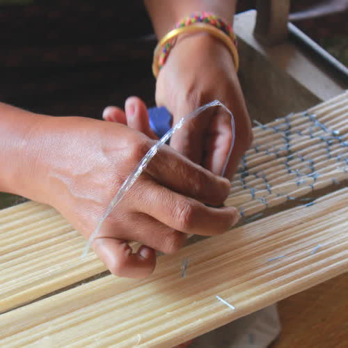 | คำอธิบาย : มัดหมี่ คือ การสร้างลายผ้าด้วยการใช้เชือกฟางมัดที่ผ้าให้เป็นลวดลายตามที่ต้องการโดยใช้อุปกรณ์คือ มีดโกนมีด้ามหรือมีดบางเล็กๆ และเชือกฟาง จากนั้นนำไปย้อมสี เมื่อแกะเชือกฟางที่มัดออกก็จะเกิดลวดลายต่างๆ หากต้องการให้ผ้ามีหลายสีก็ใช้เชือกฟางมัดลายแล้วนำไปย้อมสีหลายครั้ง |