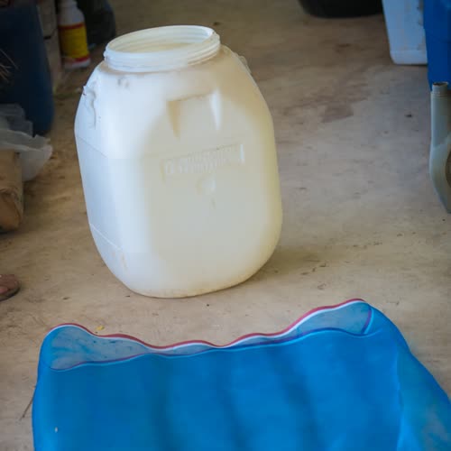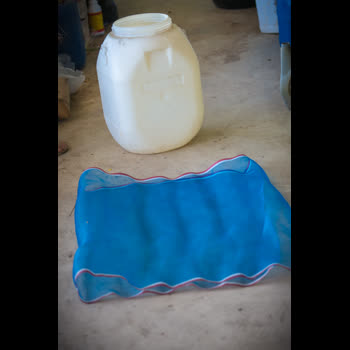| คำอธิบาย : เตรียมผ้ามุ้งไนล่อนสีฟ้าหรือมุ้งเลี้ยงปลา สำหรับไว้ห่อมูลไส้เดือน และเตรียมถังน้ำสำหรับแช่ |