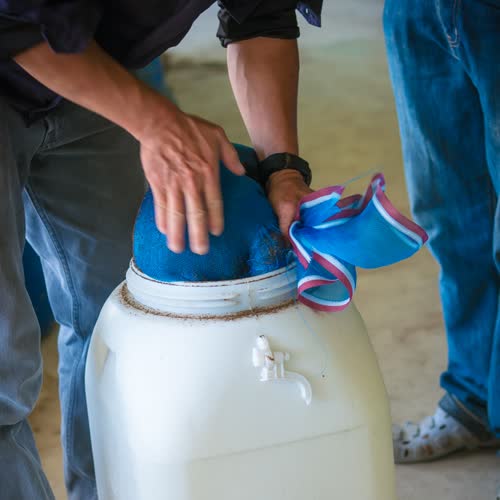 นำห่อมูลไส้เดือนนั้นใส่ไปในถังที่เตรียมไว้ ได้รับใบอนุญาตภายใต้ ให้เผยแพร่-ดัดแปลง-โดยต้องระบุที่มา 3.0 Thailand.