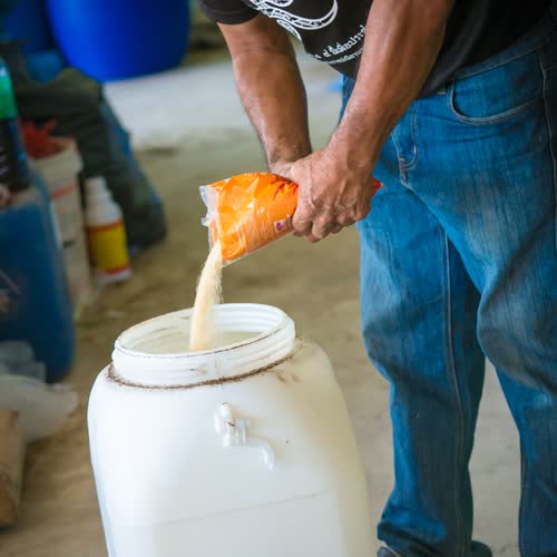 | คำอธิบาย : ใส่น้ำตาลทรายแดงหรือน้ำตาลสีรำก็ได้ ไปในถังที่เตรียมไว้ |