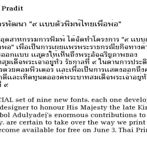 | คำอธิบาย : โครงการพัฒนา "๙ แบบตัวพิมพ์ไทยเพื่อพ่อ"สหพันธ์อุตสาหกรรมการพิมพ์ ได้จัดทำโครงการ "๙ แบบตัวพิมพ์ไทยเพื่อพ่อ" เพื่อเป็นการเผยแพร่พระราชกรณียกิจทางด้านศิลปะและการออกแบบ แสดงให้เห็นถึงพระอัจฉริยภาพของพระบาทสมเด็จพระเจ้าอยู่หัว รัชกาลที่ ๙ ในด้านการประดิษฐ์ตัวอักษรด้วยคอมพิวเตอร์ และเพื่อเป็นการแสดงออกถึงความจงรักภักดีและเทิดทูนต่อองค์พระบาทสมเด็จพระเจ้าอยู่หัว รัชกาลที่ ๙วัตถุประสงค์๑. เพื่อแสดงออกถึงความจงรักภักดีและเทิดทูนต่อองค์พระบาทสมเด็จพระเจ้าอยู่หัว รัชกาลที่ ๙๒. เพื่อเป็นประวัติศาสตร์แบบตัวพิมพ์ไทยในรัชกาลที่ ๙๓. เพื่อแสดงให้เห็นถึงพระอัจฉริยภาพของพระบาทสมเด็จพระเจ้าอยู่หัว รัชกาลที่ ๙ ในด้านการออกแบบ และการประดิษฐ์ตัวอักษรด้วยคอมพิวเตอร์๔. เพื่อสร้างสรรค์แบบตัวพิมพ์แจกจ่ายให้ประชาชนชาวไทยได้ใช้ฟรี ๕. เพื่อให้ภาครัฐ และเอกชน นำไปใช้เป็นแบบตัวพิมพ์สำหรับจัดงานนิทรรศการต่างๆ รวมถึงใช้เป็นแบบตัวพิมพ์ในสื่อสิ่งพิมพ์ และสื่อประเภทต่างๆ ๖. เพื่อใช้เป็นแบบฟอนต์สำหรับจัดทำหนังสือ “๙ แบบตัวพิมพ์ไทย” และหนังสือ “โครงการพระราชดำริ แนวคิดและทฤษฏี ร.๙” สำหรับจัดพิมพ์ และแจกจ่ายประชาชนฟรีทั่วประเทศ๙ แบบตัวพิมพ์ไทยเพื่อพ่อ เมื่อพัฒนาเสร็จแล้ว จะแจกจ่ายให้ประชาชนชาวไทยได้ใช้ฟรี แบบตัวพิมพ์ส่วนใหญ่ เหมาะสมกับการนำไปใช้ในกิจกรรมการจัดนิทรรศการต่างๆ โดยเฉพาะนิทรรศการเฉลิมพระเกียรติ นิทรรศการอันเกี่ยวเนื่องกับโครงการพระราชดำริ รวมถึงใช้ในงานสิ่งพิมพ์ และสื่อประเภทต่างๆ |