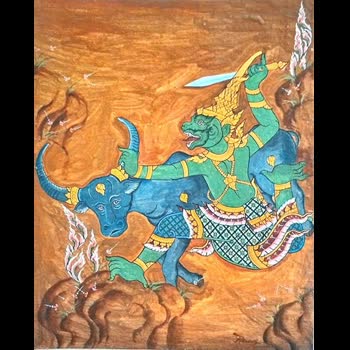 | คำอธิบาย : ภาพพญาพาลีปราบทรพี ทรพีเป็นควายป่ามีฤทธิ์มากเมื่อเป็นหนุ่มได้ฆ่าพ่อของตัวเองเพื่อชิงความเป็นใหญ่ (ที่มาของคำว่าลูกทรพี) และยังอาจหาญไปท้าพระอิศวร ที่ว่าทรพีเป็นควายนั้นเข้าใจว่าเป็นชนเผ่าที่นับถือควายในปัจุบันยังมีอยู่พวกนี้โหดร้าย นิยมติดหัวกระโหลกควายบนหลังคาบ้าน และเอาเขาควายมาติดที่ศีรษะ พระอิศวรให้ไปรบกับพาลีพาลีเป็นลูกของนางกาลอัจนาที่พระอินทร์มาเป็นชู้กายสีเขียว(ตามพระอินทร์) มีน้องชื่อสุครีพกายสีแดง ตามสีของพระอาทิตย์ที่มาเป็นชู้ ทั้งคู่จึงถูกพระฤาษีโคดมสาปให้เป็นลิง พาลีครองเมืองขีดขินมีสุครีพเป็นอุปราช วันหนึ่งสุครีพไปช่วยพระอิศวรยกเขาไกรลาศ พระอิศวรประทานนางดาราให้แต่ฝากมากับพาลี (บ้าจริงๆ) พระนารายณ์ท้วงว่าอาจมาไม่ถึงสุครีพ เหมือนฝากปลาย่างมากับแมว พาลีสาบานว่าถ้าเป็นอย่างนั้นให้ตายด้วยพระนารายณ์ และพาลีก็ผิดคำสาบานจริงๆ แต่สุครีพก็ไม่ว่าอะไร พาลีสามารถฆ่าทรพีได้โดยลวงให้ไปรบกันในถ้ำถ้าเลือดสีจางให้สุครีพเอาหินปิดปากถ้ำเพราะเป็นเลือดลิง แต่ถ้าเลือดเป็นสีเข้มไม่ต้องปิดปากถ้ำเพราะเป็นเลือดควาย เมื่อทรพีตายเทวดาดีใจปล่อยฝนตกทำให้สีเลือดจาง สุครีพคิดว่าพาลีตายเลยปิดปากถ้ำ พาลีโกรธคิดว่าสุครีพจะฆ่าตน (เพราะระแวงด้วยไปแย่งเมียเขา) จึงขับไล่สุครีพๆไปพบหนุมานและไปขอให้พระรามมาปราบพาลีจะได้กองทัพเมืองขีดขิน ในที่สุดพาลีก็ตายตามคำสาบาน |