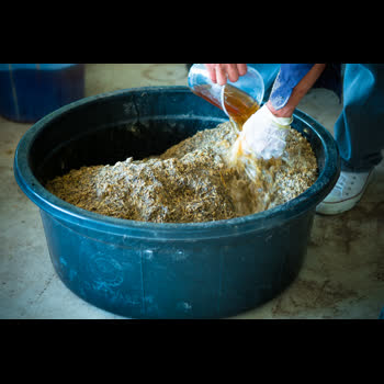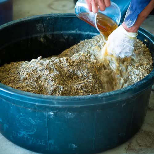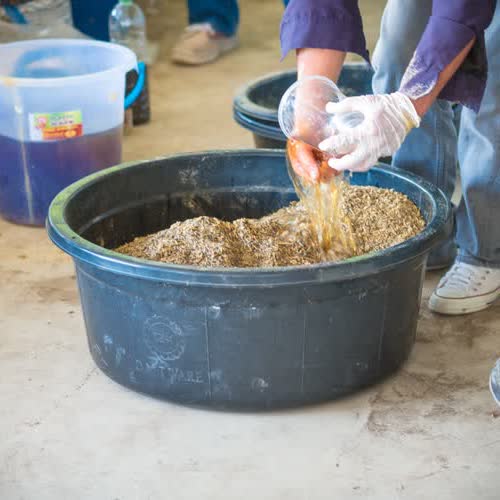 | คำอธิบาย : ราดส่วนผสมแบบน้ำที่เตรียมไว้ ไปที่ส่วนผสมแบบแห้ง ในการทำปุ๋ยหมักแบบโบกาฉิ |