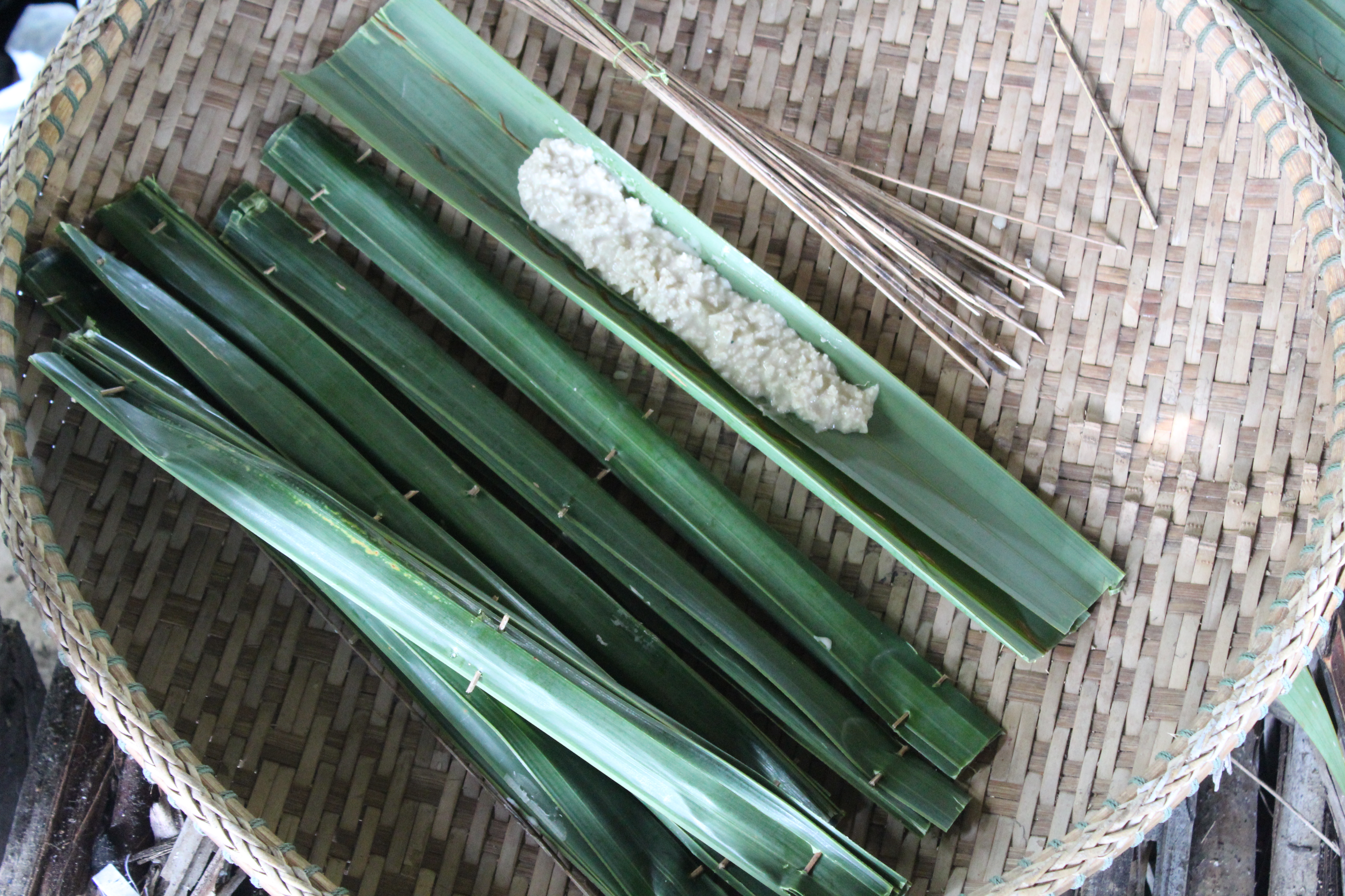 | คำอธิบาย : วัสดุในการห่อขนมจากประกอบด้วยใบต้นจากตัดเป็นท่อนยาว 10-12 นิ้ว และไม้กลัด |