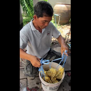 | คำอธิบาย : ไหมพื้นบ้านไทยจะมีเส้นใยสีเหลืองทอง ก่อนนำมาย้อมสีธรรมชาติ ต้องทำการฟอกกาวออกจากเส้นไหม ด้วยการนำน้ำด่างของขี้เถ้าจากการเผาต้นกล้วย แล้วนำไหมไปล้างให้สะอาด ไหมพื้นบ้านจึงจะย้อมสีธรรมชาติติดดีและคงทนนาน |