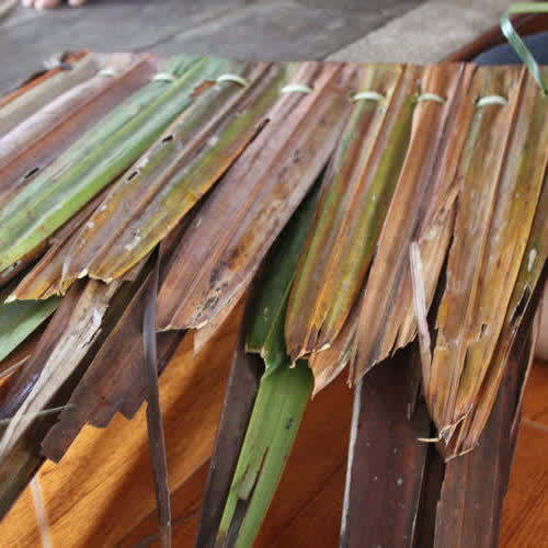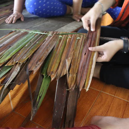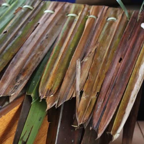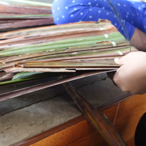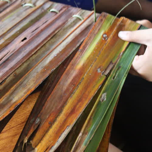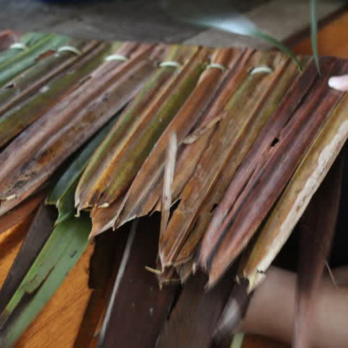 | คำอธิบาย : วิธีการเย็บจากเพื่อนำไปทำตับจากมุงหลังคา นำใบจากมาวางไว้และเอาใบจากสองใบมาวางเรียงกันเย็บจากข้างบนลงข้างล่าง เอาใบจากคู่ต่อไปมาวางเรียงต่อกันอีก ทำไปจนหมดตับ |