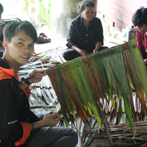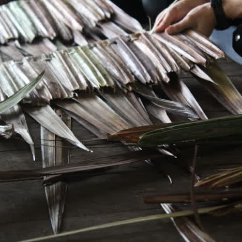 | คำอธิบาย : รวบรวมตับจากที่ผ่านการเย็บ เมื่อเย็บเสร็จแล้วจึงนำไปกองรวมกัน หรือนำไปตากเพื่อเตรียมมุงหลังคาต่อไป |